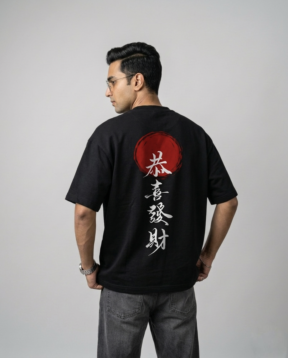 Upgrade your streetwear style with this premium Black Oversized Japanese Typography T-Shirt. Designed for those who love bold yet minimal fashion, this tee features a striking red sun graphic paired with elegant Japanese calligraphy that symbolizes positivity, growth, and prosperity.