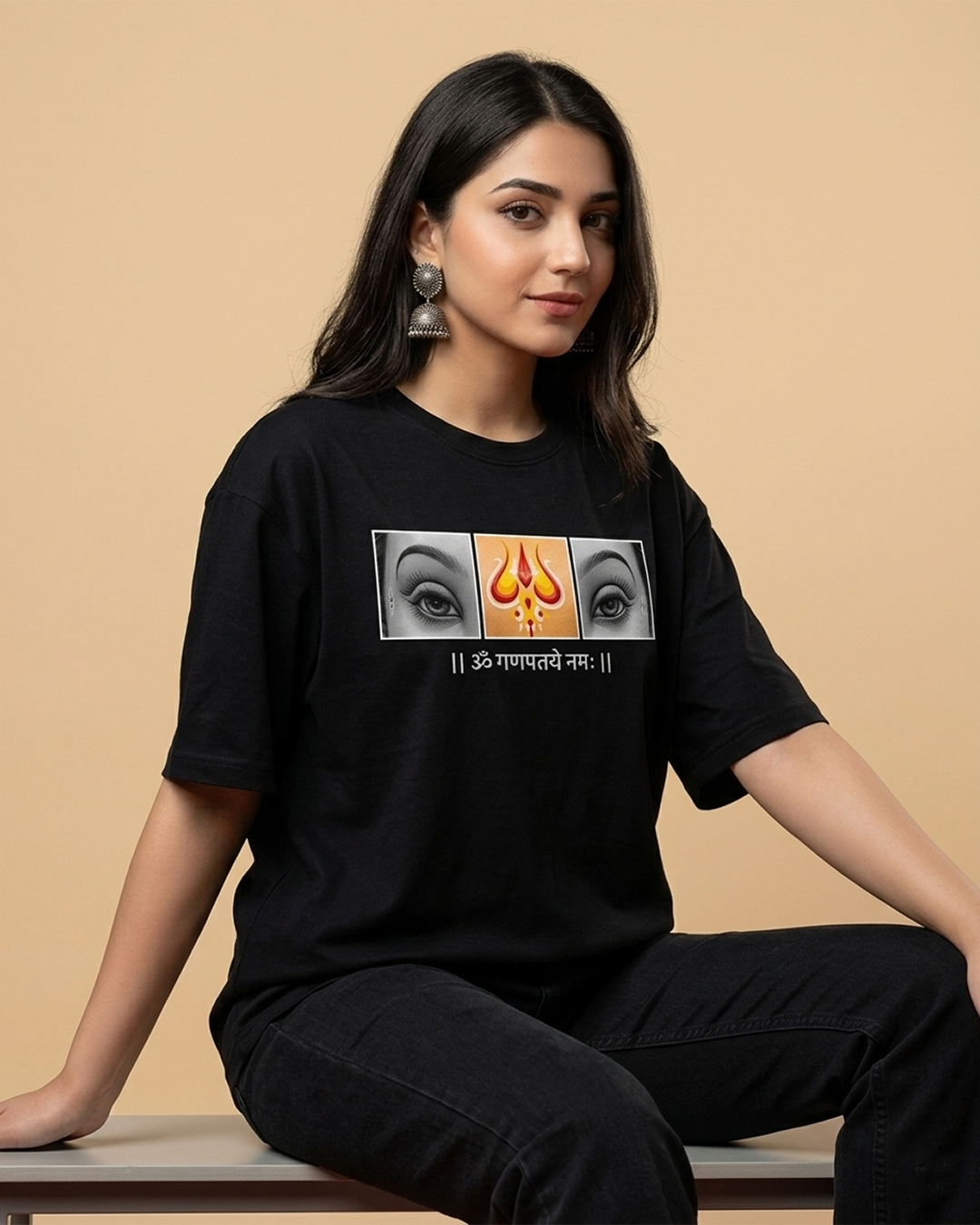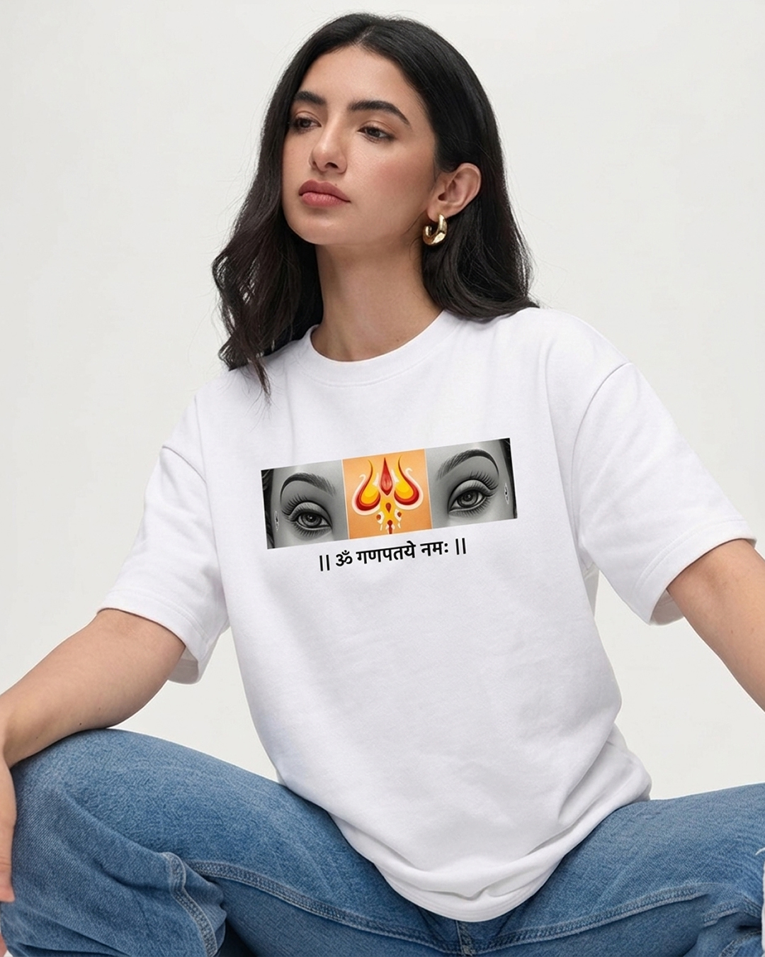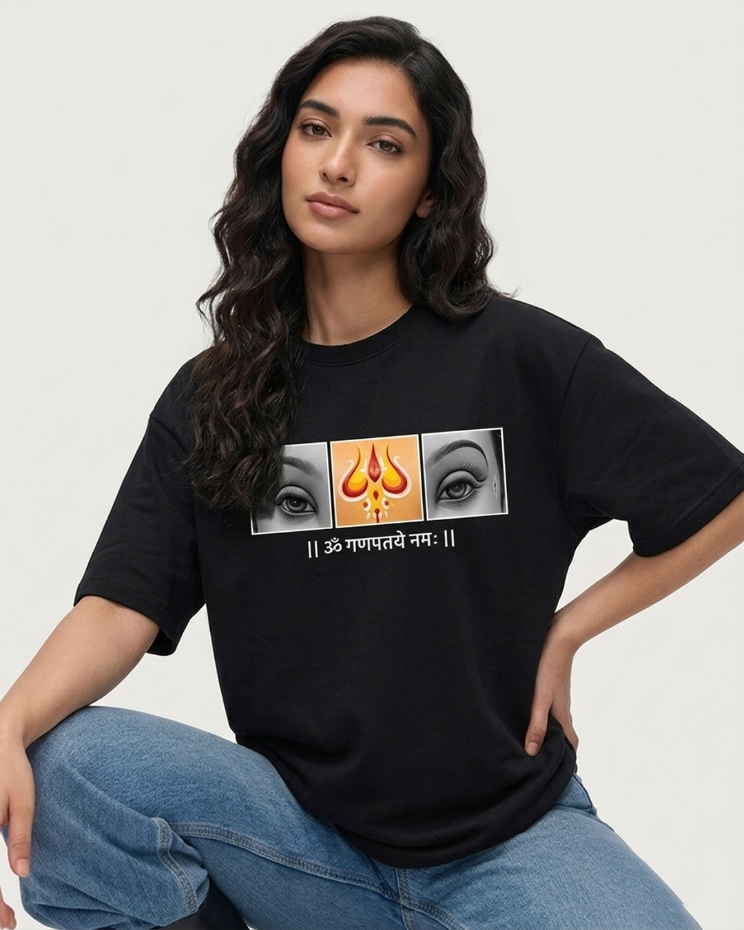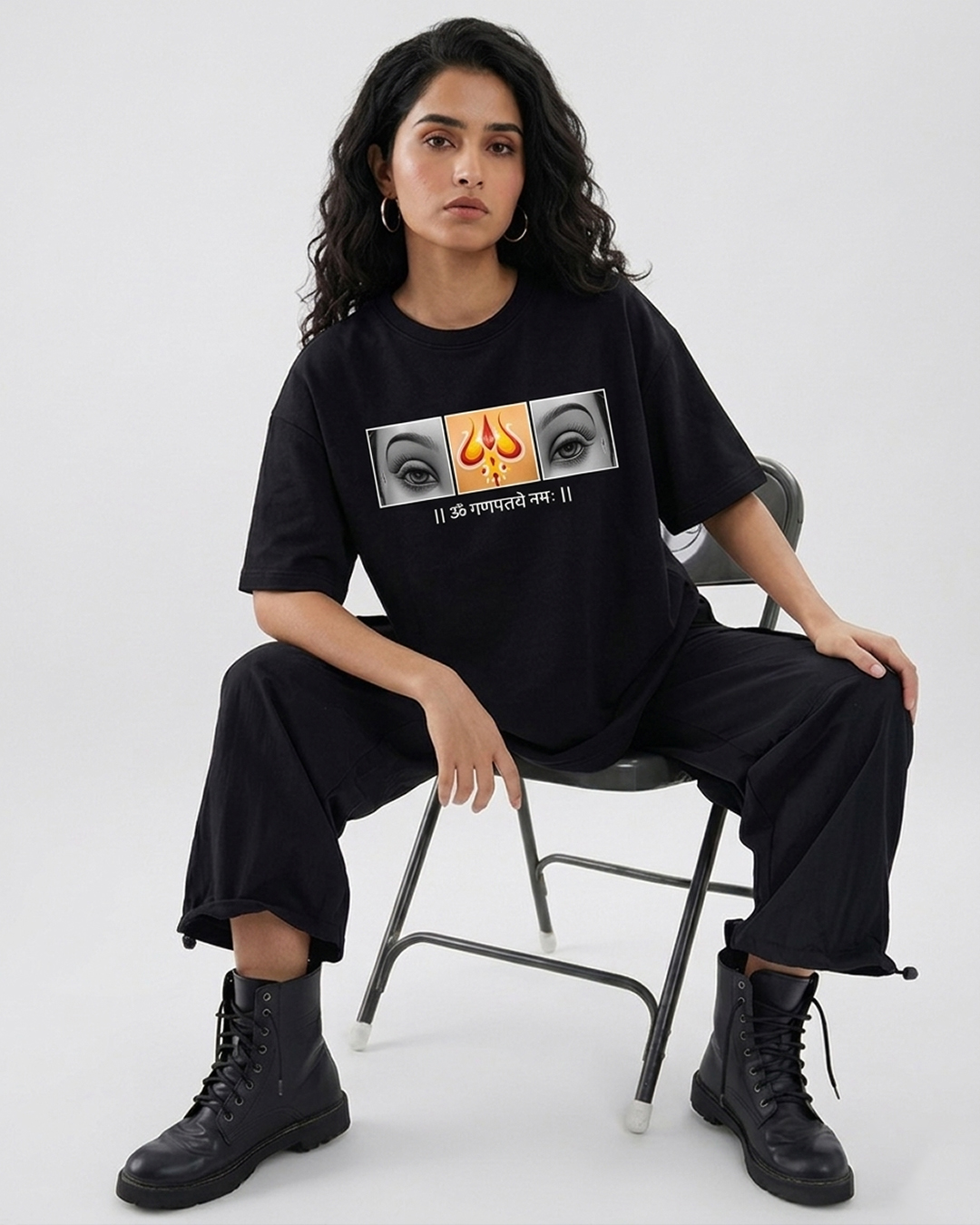 Featuring a minimal yet powerful Ganpati-inspired design (ॐ गणपतये नमः), this tee blends spirituality with contemporary fashion—perfect for everyday wear or statement styling.