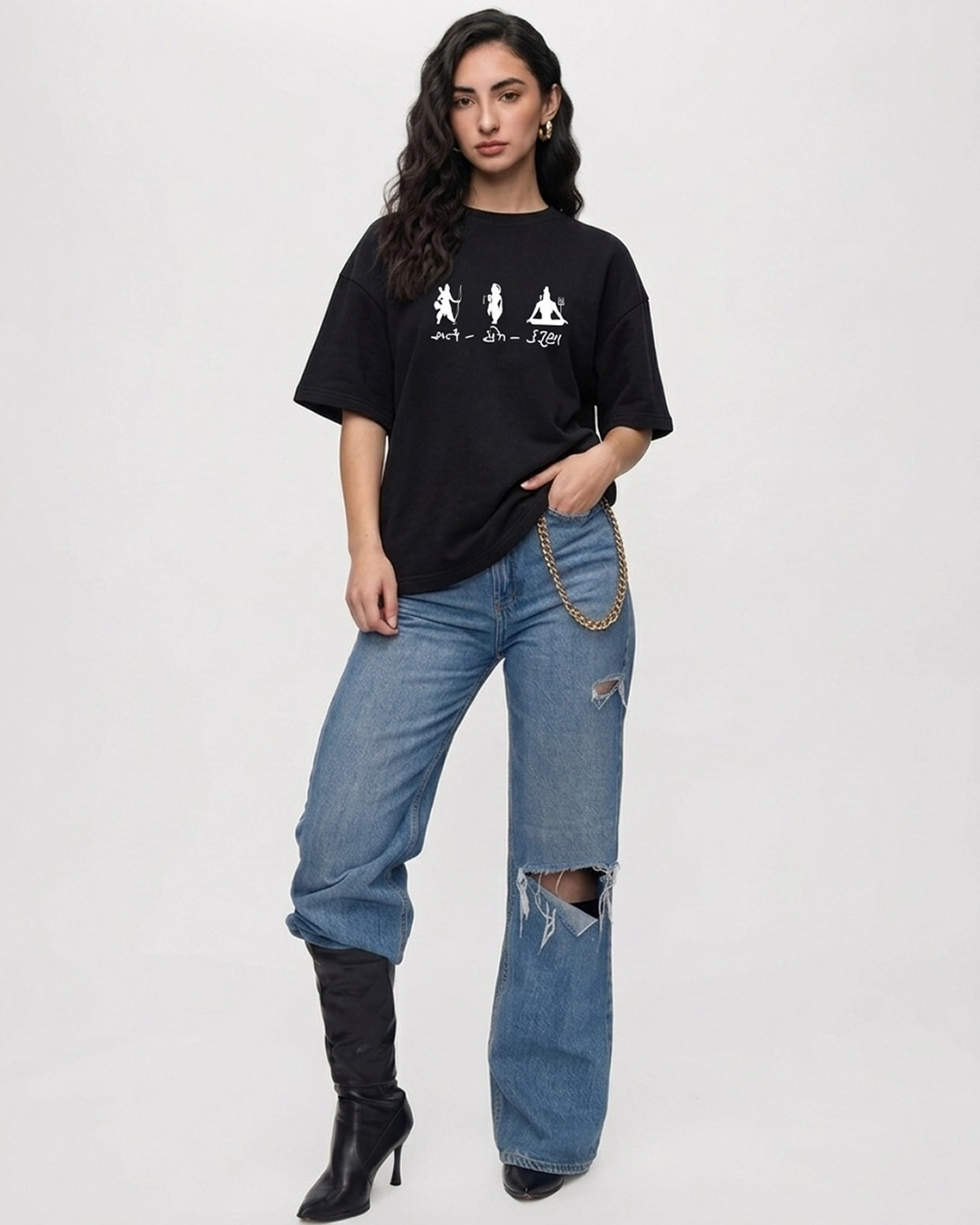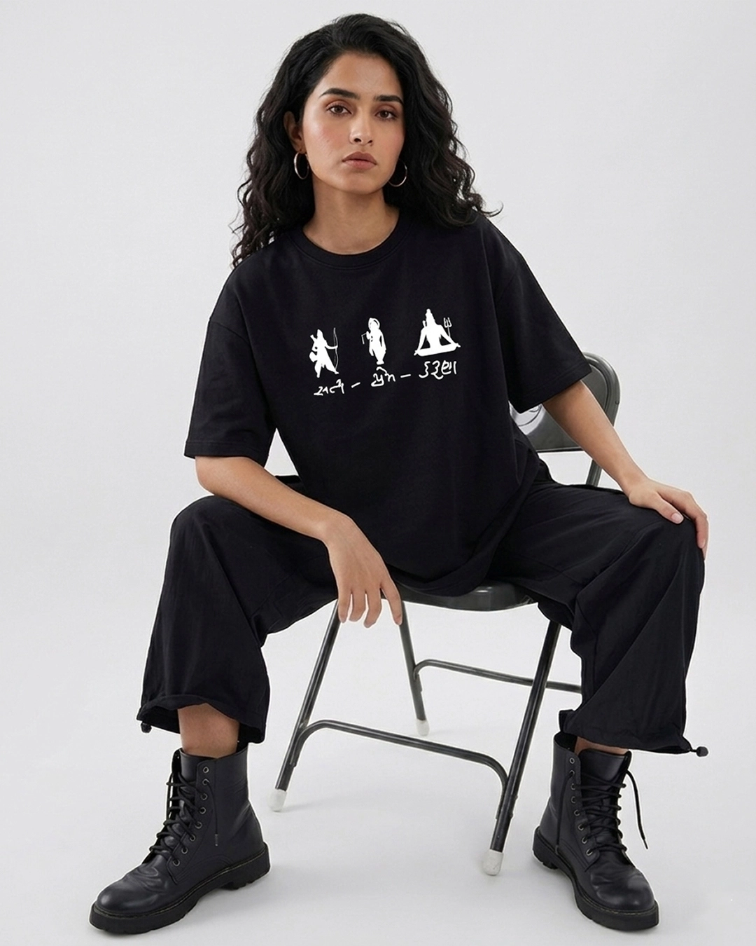 Express your inner values with Trisutra Oversized T-Shirt – Satya, Prem, Karuna Edition. Designed for those who believe in truth, love, and compassion, this t-shirt blends spiritual meaning with modern streetwear style.